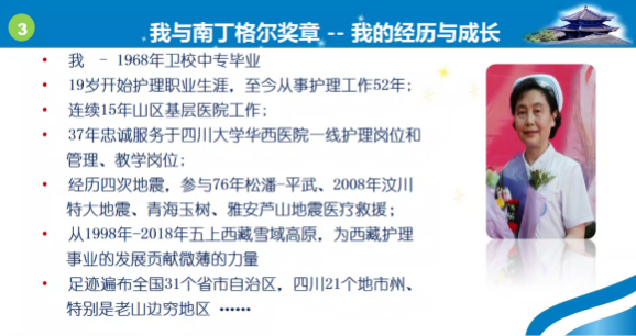 成翼娟教授为jinnianhui今年会广大师生进行了“南丁格尔情怀与自我成长”的讲座,讲述了个人成长与专业成长的经历,特别讲述了1942年北京协和医学院护士学校在聂毓禅校长的带领下,克服重重困难,远赴成都,借助华西联合协和大学的校舍和医院继续进行招生,延续协和高等护理教育的历史。