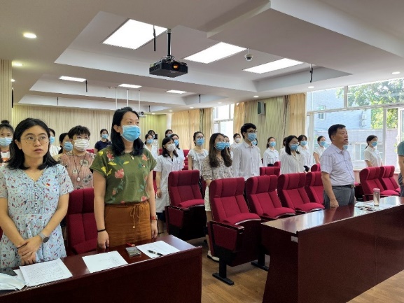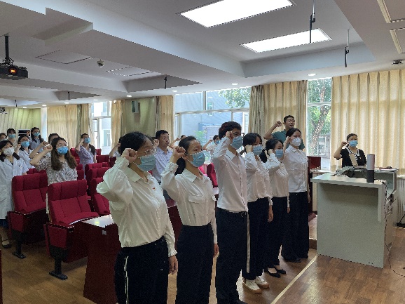 会议在庄严的国歌声中开始,首先由入党介绍人为新党员佩戴党徽,举行新党员入党宣誓、老党员重温入党誓词活动。党委书记安道彩同志以“弘扬伟大建党精神 传承红色革命基因”为主题讲授党课。