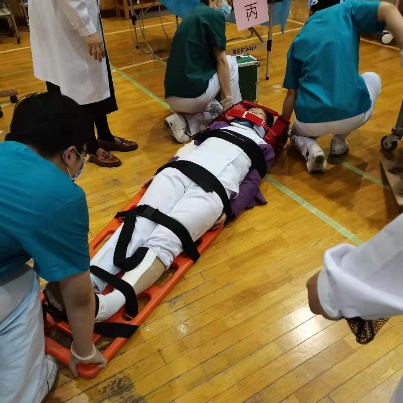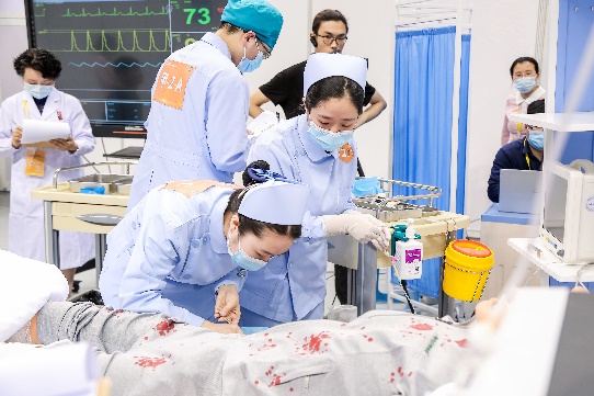 图1护理代表队白云锋、朱灿、姚家菲三位选手比赛操作