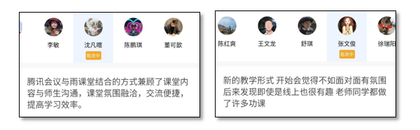 为保障同学们的学习效果,社区护理学系教师们兼顾多个平台优势,紧密衔接课前-课中-课后三个环节。课前,老师们收集文献、视频、教材资源在雨课堂平台发布,帮同学们预热,扩展知识面。课中,老师们把握当下社区防控工作的鲜活学习素材,兼顾雨课堂、腾讯会议、腾讯课堂等系统中的投票、答题、弹幕、投稿、视频播放等功能,引导同学们将自己观察和感受到的社区卫生服务工作带到课堂分享、讨论,激发同学们的学习兴趣和参与度,帮助同学们快速地适应和融入了《社区护理学》线上课堂中,学习氛围融洽。课后,老师们在雨课堂和微信群发布思考题和测试题,帮助同学们强化课堂学习效果,利用讨论区,交流思想。
