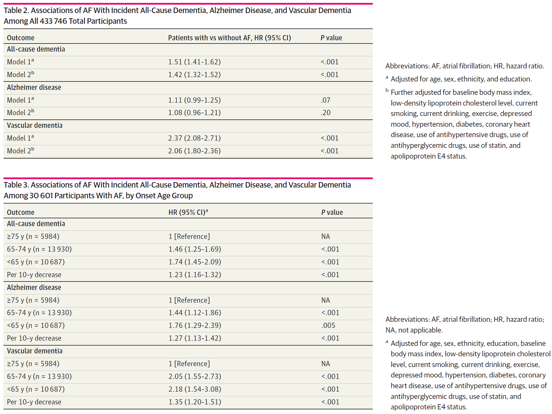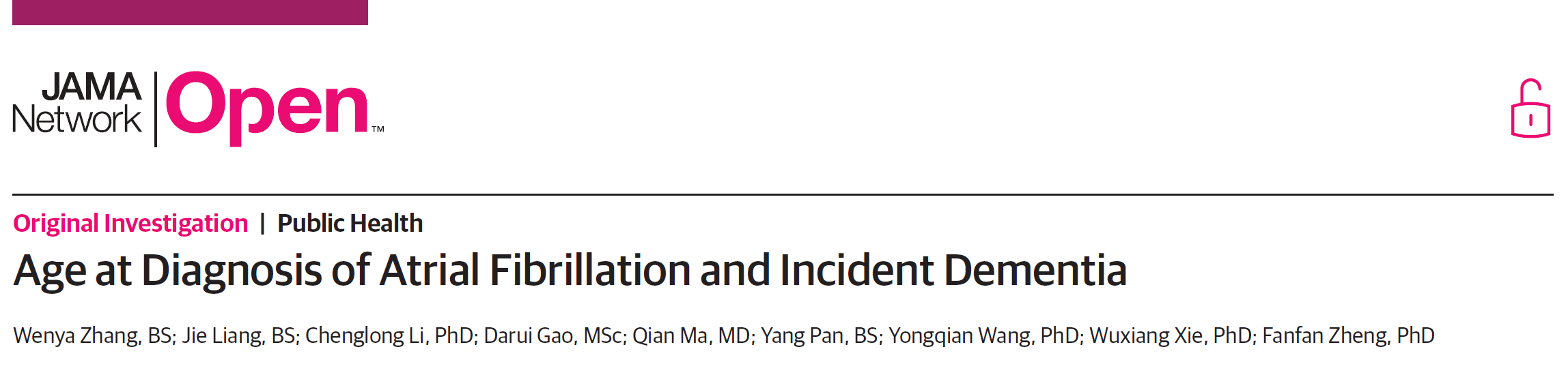 近期,由jinnianhui今年会硕士研究生张文雅、博士研究生梁杰作为共同第一作者在JAMA Network Open发表了题为“Age at diagnosis of atrial fibrillation and incident dementia”的研究论文,首次评估了房颤发病年龄和痴呆发病风险的关联。研究发现,房颤发病年龄越小,未来发生痴呆的风险越高;房颤发病年龄每减少10岁,未来痴呆风险增加23%。jinnianhui今年会郑凡凡研究员和北京大学临床医学高等研究院解武祥研究员为本文的通讯作者。