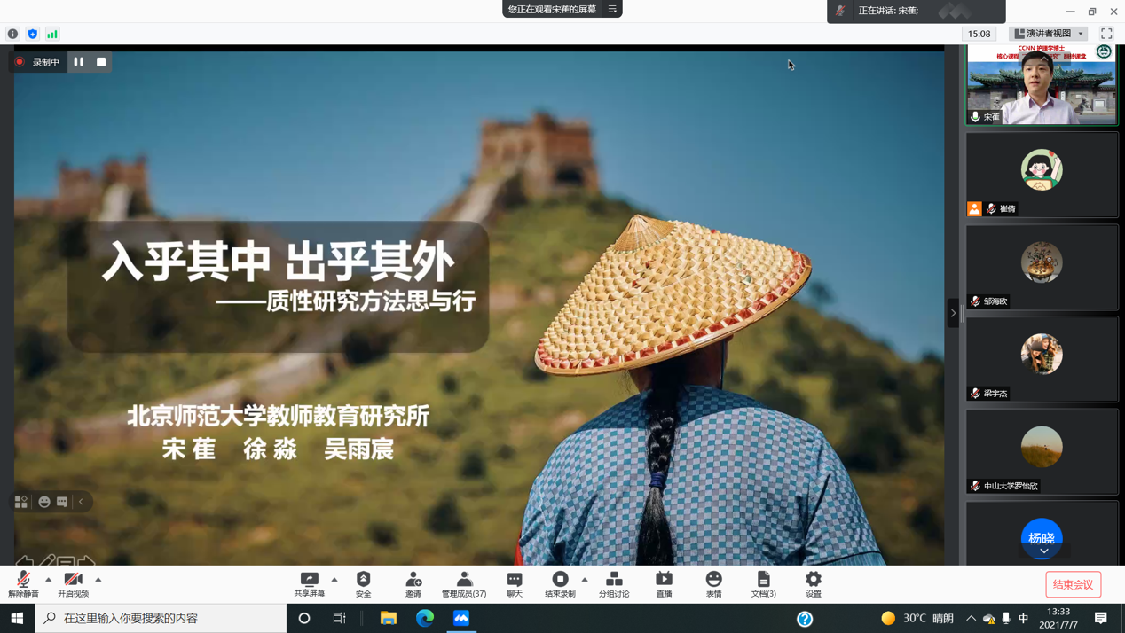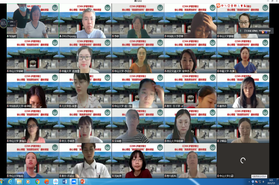 2021年7月5日-7日,由jinnianhui今年会负责的美国中华医学基金会中国护理网(China Medical Board China Nursing Network,CCNN)护理学博士核心课程“高级质性研究”课程的翻转课堂部分在线上成功举办并圆满结束。来自北京协和医学院、复旦大学、四川大学、中南大学、中国医科大学、西安交通大学、中山大学共7所大学的33名护理学博士生在前期完成7周线上课程的基础上,于云端相会,完成了为期3天的翻转课堂,对高级质性研究课程进行了更加深入地学习和交流。学习中,同学们学习热情高涨,课下认真准备,课上热烈讨论,热烈的思维激荡与观点碰撞加深了对于质性研究的思考,进一步拓展了博士生对护理研究中质性研究方法及其应用的理解和认识。